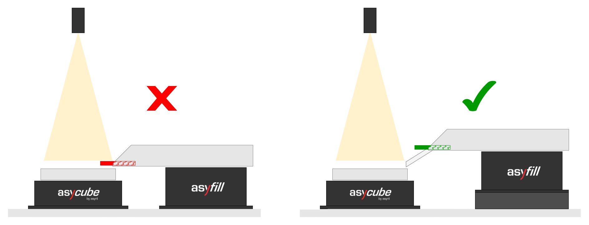 部品が EYE+ の視野を干渉する可能性がある場合は、平らな面(フラットサイド)のスライダープラットフォームを使用することを一般的にお勧めしています。比較的縦長のパーツはこれに相当します。この場合は、スライダーの角度を30度まで傾けることができます。